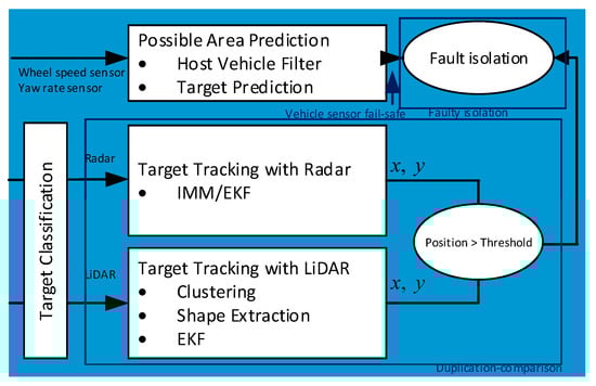 Sensing and the perception of the environment are major challenging technologies for the high-level automated vehicles. Until now, exteroceptive sensors—which are used to sense the surroundings around autonomous vehicles—such as a camera, an automotive radar or LiDAR (Light Detection and Ranging), play an important role in this domain. According to [], using fusion of vision, radar and a LiDAR system is the most common approach to achieve robust situation awareness. Therefore, this research questions how to achieve robustness of these sensors which has become an important topic. To improve vehicles’ integrity, many studies using information of vehicle sensors and actuators have already been conducted. For example, one of the previous study uses the Mahalanobis distance and chi square as a threshold to detect the fault []. The fusion of odometry with DGPS (Differential Global Positioning System), IMU (Inertial measurement uni) and magnetic field sensors is also investigated to develop fault-tolerant 3D localization system []. Although there have been extensive studies on the sensor integrity of vehicle sensors, only a few of them have focused on the reliability of environment perception sensors such as radar, camera, and LiDAR. The main contribution of this paper is the use of redundant external sensor pairs, which estimate the same target, whose results are compared to detect the fault.