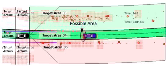 In Bader’s work [], location of the fault was identified by comparing residuals from each branch. However, it is hard to isolate faults with a target-tracking filter because not only is it more complicated but also the filter selects the most relevant measurements based on the residual—i.e., the measurement that has low residual is selected in the track management phase. Therefore, faults are identified by using possible area in this paper. As illustrated in Figure 8, if the sensor’s measurements that are not measured within the possible area, the sensor is identified as a faulty sensor.