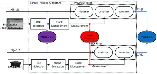 In this part, a modified duplication-comparison method is used. The overall structure of the method is illustrated in Figure 7. The two branches are the tracking algorithms of radar and LiDAR, respectively. In addition, inputs are defined as the estimation previously made and measurements are defined as longitudinal and lateral positions of radar and LiDAR measurements. If the estimated target’s position at the kth step would be different between two sensors, the algorithm checks whether it is from sensor measurements or inputs. If it is from the inputs, there is no meaning. If it is from the sensor measurements, there should be faults in the sensors themselves. On the other hand, this mechanism can be stated in another way. When the assumption is that there is a real vehicle (if it is validated as a vehicle by both sensors over ten seconds is true), there should be an anomaly in the sensing system when the estimation results deviate from each other.