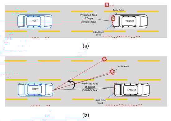 The eight classified targets’ overall behaviors are estimated and represented by each sensor. In the case of the radar sensor, it is hard to estimate target vehicles’ position because radar measurements are wandering on the physical surface of the vehicle. Therefore, 12 measurement points are defined on the edges of vehicle and used as a measurement model. The measurements are updated 12 times to estimate target vehicles’ states and the model that has the highest possibility is selected by the interacting multiple model filter. In addition, the process model which represents the vehicle’s movement with no slip () assumption is used. The discretized version of the process model is described as follows: