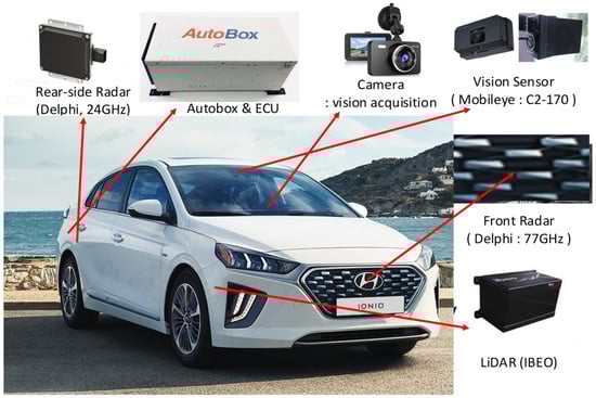 The real-driving data used for fault injection experiments were recorded when the test vehicle was driven on the urban road of Changwon-Si in Korea. The test vehicle is described in Figure 9. It is a sedan equipped with various in-vehicle sensors, a camera, a vision sensor, radars and a LiDAR. The radar installed in the vehicle is a Delphi radar with 77 GHz. In addition, LiDAR installed in the vehicle is an IBEO LiDAR. It is an about 1.1 km of the urban road of Changwon-Si which includes significant road curvature. The aforementioned sensors sensed not only the preceding vehicle but also various environmental factors, such as parked cars, curbs, trees or fences, during driving.