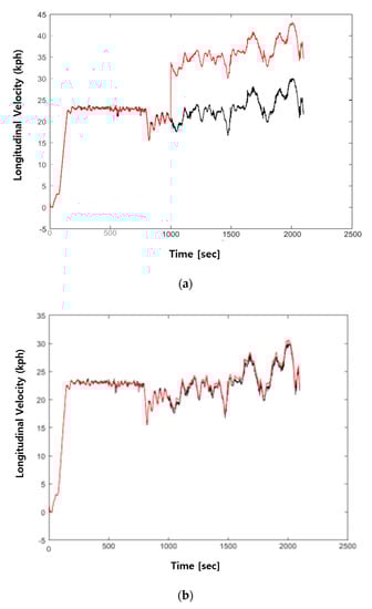 The estimated velocity of the host vehicle and the driving data are plotted in Figure 11a. The black solid line indicates vehicle velocity without faults in sensors and the red solid line indicates vehicle velocity when the rear-right wheel speed sensor failed. The 7.5 m/s additive fault was injected into the simulation at 100 s. When the Kalman filter equips the fail-safe algorithm, there is no difference between the estimated velocity without faults and that with faults as described in Figure 11b.