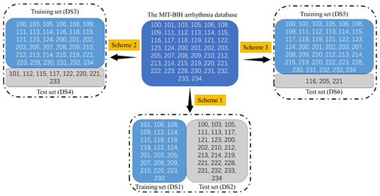Taking Scheme 1 in Table 2, splitting data into training and test sets, and Figure 3, splitting data into training and test sets, the information in Figure 3 is the same as in Table 2. As an example: the “DS1” and “DS2” represent the training set and the test set. The “101” represents the records number in the MIT-BIH arrhythmia database. The “N” and “V” respectively represent the number of the regular beat and PVC in the dataset. The “Ratio” means the ratio of the samples’ number in the training set and the test set, such as (35640 + 2851)/(33868 + 2548) = 0.9778. Notably, most researchers adopt Scheme 1, which AAMI suggested and can also guarantee a reasonable comparison between our proposed method and other studies. Scheme 2 and Scheme 3 can evaluate the proposed method’s performance in the situation that the number of samples in the training set is higher than the test set.