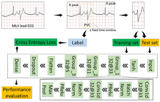 Figure 4 shows a block diagram of the proposed study, with a view showing the proposed method’s flow. Initially, this research divided each ECG signal from the modified limb lead II (MLII) into separate heartbeats according to a fixed time window and an R peak detection algorithm. The duration of each heartbeat composed of 433 sampling points is 1.2 s. Then the proposed model based on the one-dimensional CNN takes these heartbeats as input to search PVC.