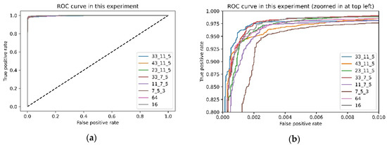 The kernel size is usually related to the receptive field (RF), the size of the region in the input that generates the feature. In many outstanding image classification or detection algorithms, the kernel size is usually 3 × 3, 5 × 5, or 7 × 7 and decreases gradually. In this experiment, we tried multiple combinations of the size and number of kernels. The data for training and verifying are both from Scheme 1. Besides, the experimental environment is also the same. The strategy for adjusting the learning rate is multiplying the learning rate by 0.1 when the network reaches the 20th and 80th epoch. Moreover, Table 5 shows specific details and results. Figure 5 displays the receiver operating characteristic (ROC) curve about this experiment.