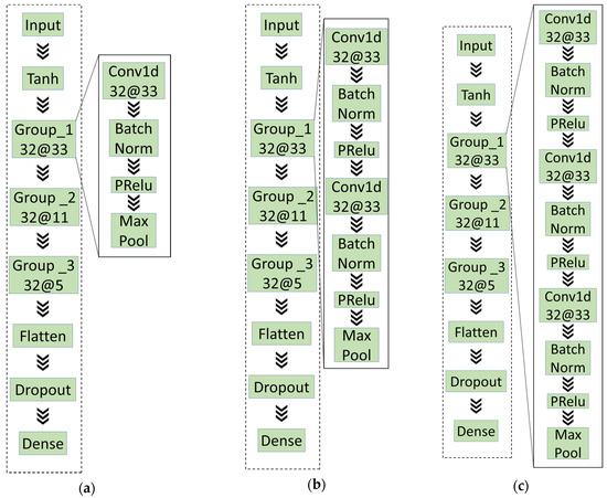 Secondly, the proposed model has three convolutional groups, as shown in Figure 4. Each convolutional group contains five layers. A one-dimensional convolutional layer is a powerful tool that results in a feature map representing a detected feature’s positions and intensity in an input. Convolution is a simple operation: