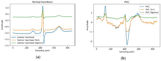 Tanh and Sigmoid normalize the waveform of a normal heartbeat and PVC.