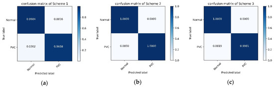 The confusion matrix of each scheme: (a) confusion matrix of Scheme 1; (b) confusion matrix of Scheme 2; (c) confusion matrix of Scheme 3.