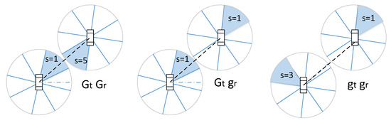 The directivity gain of both antennae was experimented on in our previous work [1]. We denote antenna gain of bore sight (i.e., main-lobe) and others (i.e., side-lobe) as G and g, respectively; main-lobe gain is and side-lobe gain is when the front-to-back lobe ratio (FBR) is (0 ≤ 1, 1 for omni-direction). As shown in Figure 2, Tx and Rx antennae of vehicles can steer toward different sectors and beam-forming gain can be varying according to the directivity of those antennae. In Equation (4), connectivity range can be determined by the directivity gain of the Tx and Rx antennae as illustrated in Figure 3. When both antennae face toward each other, coverage is with gain . Directivity gain from only one antenna leads to or and coverage . Otherwise, the gain can be only and its coverage is .