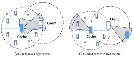 Caching probability is a proportion of sectors that contain coded caches over total sectors. For example, the is and when the and in the example of Figure 5a,b, respectively.