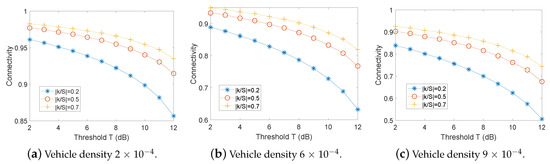 Connectivity () versus vehicle densities with threshold T = 10 dB.