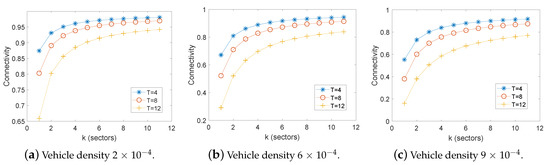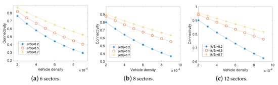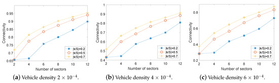 The degree of sectorization can enhance vehicle connectivity by increasing spatial diversity. In Figure 8, the connectivity increases as vehicles have a higher probability to avoid inter-beam interference with more sectors. In addition, more antenna gain can be acquired from narrow beam-width. For , the connectivity of two and four sectors are similar because both have only one cached sector and beam-forming gain is comparable. This connectivity gain from sectorization is notable especially with higher vehicle density as shown in Figure 8a,c. However, the connectivity increment becomes saturated. For example of Figure 8a, the connectivity increases almost 8% from 4 to 6 sectors, but only 2% from 6 to 8 sectors in case of . In other words, there is a limitation to increase diversity gain from sectorization at a given vehicle density.
