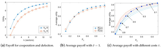 Figure 10b depicts average utility with normalized defined by Equations (31) and (32), where the number of cooperation sectors is one more than defection. Cooperation utility is little bit higher with low cooperation probability, , but lower with high than the defection utility. Accordingly, a vehicle probably chooses a cooperation strategy in lower while a defection strategy in high .