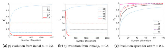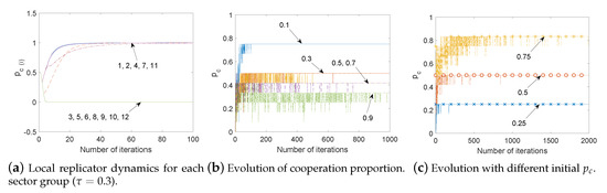 Figure 12 shows evolution based on local replicator dynamics that has no global information of other vehicles’ selection. All vehicles conduct mixed strategies based on own probability for each iteration. Each vehicle updates the using the replicator dynamics of Equation (34) based on its history. There are many possible ESSs for this heterogeneous players’ game; all combinations of 1 or 0 for the of each sector are candidates or when . For example, the sector 1, 2, 4, 7 and 11 choose cooperation strategy with while others choose defection as shown in Figure 12a, where evolution speed is 2, cost is 0.3 and initial is 0.5. Coincidently, above ESS is the same as the result of centralized approach shown in Figure 11a,b, but it could be varying according to strategies chosen at initial phase of the iterations. Figure 12b shows proportion of cooperative sectors over total 12 sectors with different from 0.1 to 0.9. At an initial iteration where vehicles pursue a mixed strategy, the proportion changes dynamically, but it converges into a stable state as individual increases or decreases into 1 or 0. In contrast to the global algorithm that leads to a single ESS regardless of the initial state, the distributed algorithm can cause different stable points according to the initial as shown in Figure 12c. When each vehicle has own initial such as 0.75, 0.5 and 0.25 with cost , we can observe that cooperation proportion reaches into the stable point similar with the individual initial . With higher initial , each vehicle has higher probability to choose a cooperation strategy and experience better payoff, which increases the into 1. Otherwise, a vehicle may have better average payoff from defections rather than only a few cooperation because other cooperators raise the overall payoff at each iteration, and finally its goes to 0.