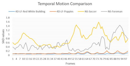 According to the LF characteristic, adjacent views in the 4D-LF pseudo-sequences both horizontally and vertically exhibit higher similarity with each other. Therefore, the 4D-LF pseudo-sequences are mostly considered low-motion sequences compared to natural videos according to the SAD values shown in Figure 4.