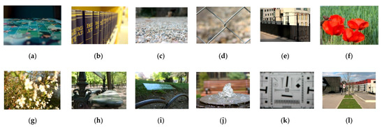 Thumbnails of light field images: (a) game board, (b) books, (c) grave garden, (d) chain link fence 1, (e) black fence, (f) poppies, (g) Mirabelle prune tree, (h) bench in Paris, (i) caution bees, (j) fountain and bench, (k) ISO chart 13, (l) red and white building.