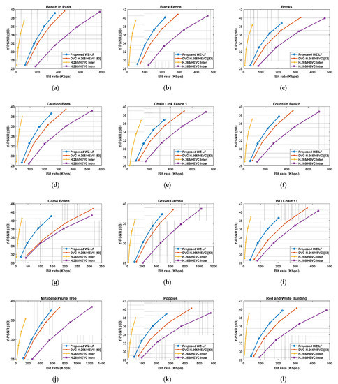 Overall rate distortion (RD) performance evaluation for the proposed Wyner–Ziv (WZ)-LF coding solution: (a) Bench in Paris. (b) Black Fence. (c) Books. (d) Caution Bees. (e) Chain Link Fence 1. (f) Fountain Bench. (g) Game Board. (h) Gravel Garden. (i) ISO Chart 13. (j) Mirabelle Prune Tree. (k) Poppies. (l) Red and White Building.