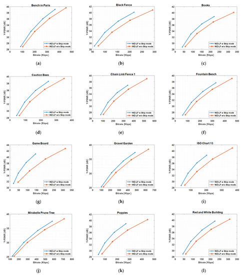 RD performance evaluation of WZ-LF with skip and non-skip mode decisions: (a) Bench in Paris. (b) Black Fence. (c) Books. (d) Caution Bees. (e) Chain Link Fence 1. (f) Fountain Bench. (g) Game Board. (h) Gravel Garden. (i) ISO Chart 13. (j) Mirabelle Prune Tree. (k) Poppies. (l) Red and White Building.