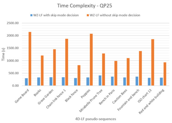 Examining the compression complexity is an essential part of the performance evaluation. For this evaluation, the coding solutions are tested on the same PC with an Intel Core i7-7700HQ (2.8 GHz) processor, 16 GB RAM, and Windows 10-Home OS. The results are shown in Figure 9 and Figure 10, respectively, for Quantization parameter (QP) of 40 and of 25, with and without the skip mode decision. To avoid the effect of multi-thread processing during the test, the results of five repetitions of the same compression setting are averaged. Additionally, the time saving (%) is measured as: