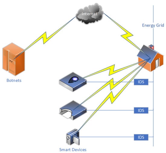 In Figure 2, smart devices are connected to the power grid (power supply) via the proposed SmartShell device. The topology shows the scalability of the proposed solution, allowing a theoretically infinite number of IoT devices to be protected. The IoT devices are connected to the Internet via the ISP router installed at home. The botnets attack to this network of devices, activating sophisticated attacks, which are usually not detected due to the absence of special security hardware installed at home (e.g., hardware firewalls, IDS). The presence of the SmartShells allows autonomous operation preventing the spread of a bot in the home installed devices. A strong characteristic of this solution is that each SmartShell is trained based on the functionality of the attached IoT device, offering a sophisticated monitoring mechanism.