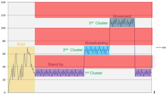 Figure 4 shows an example of the targeted IoT device (web camera) current consumption on different modes (Boot, Stand By, Broadcasting, Movement). While an IoT device is booting, the current consumption is not stable, and it should not have been included in the training or an intrusion detection algorithm. The training or the intrusion detection mode can start when the boot sequence has finished. While the system is in training mode, it creates different data clusters for the modes of operation of the IoT device, as illustrated in Figure 4 Stand By (24–38 mA), Broadcasting (58–72 mA), and Movement (102–116 mA).