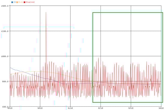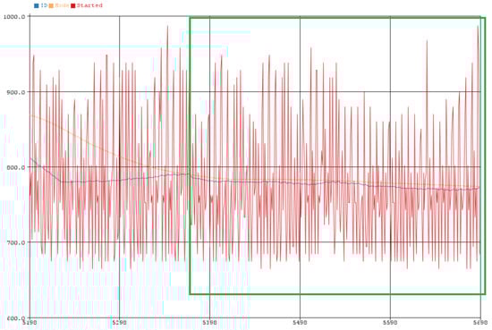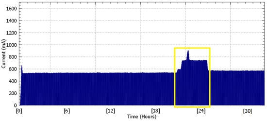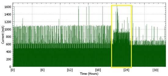In Figure 5, the measurements of the supply current during the experiment (32 h) are shown, without the use of any filter (hardware or software). As a result, there is a lot of noise in the signal (spikes) that affects the detection of the attack using thresholds, as it may be observed within the yellow frame.