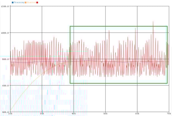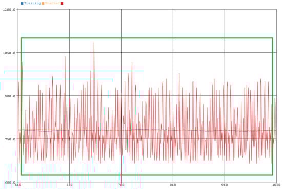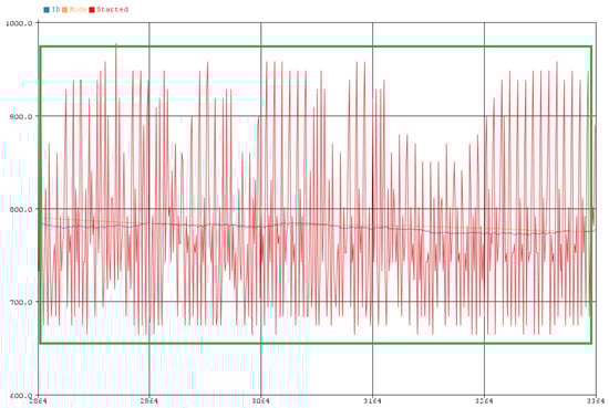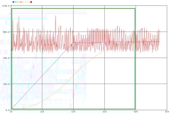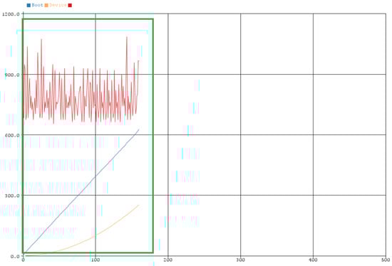 The operation of the SmartShell device had four operating modes which are analyzed below, as derived by the ML algorithm. The red line in the diagrams shows the current intensity, while the blue and yellow line the values from the first and second software filter, respectively, which were mentioned above. In addition, in the upper left part of the images, the current mode of the SmartShell device is indicated. Each IoT device starts using multiple resources, resulting in greater current intensity in its operation. Thus, an initial idle time was selected to start the IP camera (5 min), without starting its training. The above mode is called “Boot Device” and can be seen in Figure 8 and Figure 9. It was noticed that the camera from one point onwards, begins to reach a normal behavior (see Figure 9, after the green frame), as the values converge.