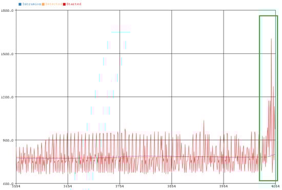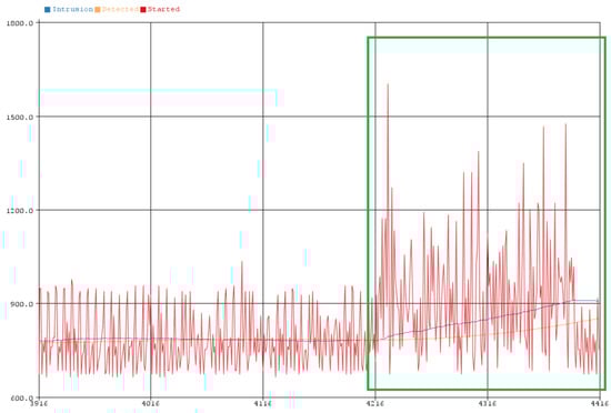 Finally, in Figure 14 and within the green frame, the detection of the attack is detected as depicted at the characteristics in a very short time (real-time detection) by the device, since the rate of sampling as mentioned above is 100 ms. During the detection of the attack, the system updates by displaying a message “Intrusion Detected Started” as seen in Figure 14 and Figure 15 top left. The current mode of operation of the device is called “Intrusion Detected Started”.