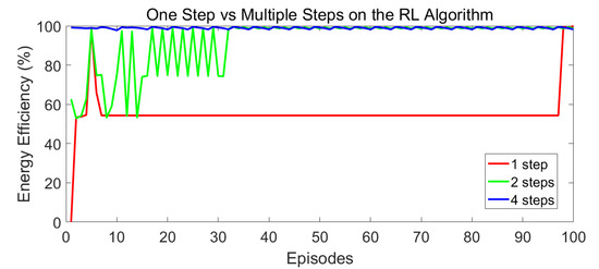 Figure 3 shows the one-step and multistep learning curves for the PMU-RL learning process that demonstrate the PMU-RL agent’s gradual approach to additional rewards by taking appropriate action, and then increasing the energy efficiency. Meanwhile, it is also suggested that this multistep PMU-RL algorithm achieves high energy efficiency in learning faster, which means that it is more suitable for power saving. Following the results of multi-step Q learning, it is compared with the Q learning algorithm to obtain the optimal power under different steps, and the differences are shown. The algorithm of 4 steps can achieve the fastest learning effect without requiring more steps.