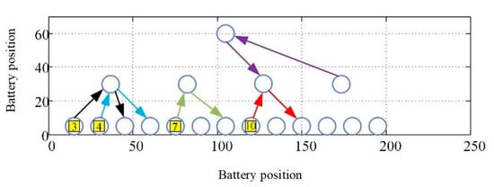 Then, we do the simulations for the best efficiency of the balancing system, that is, the least energy loss during the balancing process. The optimal balancing path planning scheme is shown in Figure 9, in which the horizontal and vertical coordinates represent the position coordinates of the batteries, and the blue hollow circles represent the battery cells. The batteries are numbered from left to right, 1 to 13, respectively. The yellow numbers in the hollow circles indicate the target cell. For instance, the number 1 battery position has a yellow number 3, which indicates that the number 1 battery discharge to number 3 battery through the transition node, and others are the same. It can be seen that in the best efficiency strategy, all the balancing paths are within the bottom equalizer. In this way, the energy transmission is direct, the number of energy conversion times is small, the energy consumption of the balancing process is little, and therefore the balancing efficiency is high. The battery voltages before and after equalization are shown in Figure 10. After equalization, the maximum voltage difference between the batteries is within 0.1 V, satisfying the constraint conditions. The simulation results show that the loss equivalent of the whole balancing process is 0.2305 after the optimization and the balancing time is 20,100 s.