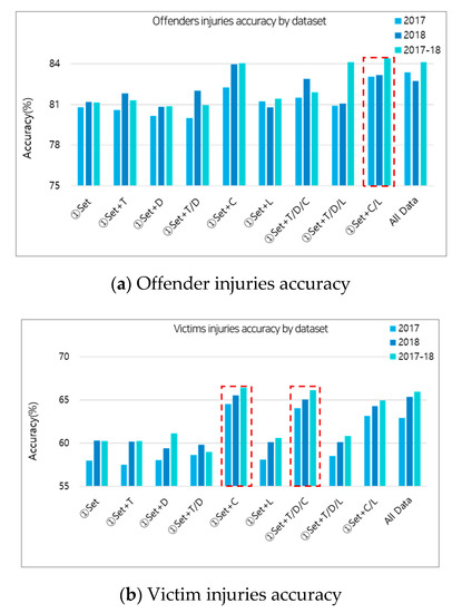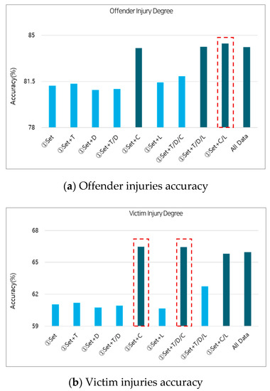 Learning based on the optimization model was carried out to identify factors affecting the degree of offender injury. As shown in Table 7 and Figure 4, the ① set, which only uses external factors, showed 81.16% prediction accuracy. It means that more than 80% of the injury to the offender can be predicted using external factors only. In addition, 84% prediction accuracy was achieved on the degree of injuries if additional factors of the vehicle were applied to the ① set, and 84.38% accuracy was confirmed when the vehicle type and the violation of the law were taken into consideration. As with offender factors, 61.05% accuracy was confirmed for the victim’s injury when using external factors only. In addition, 66.46% of accuracy was observed in predicting victim’s injuries when vehicle type was added to ① Set and 64.43% accuracy when adding time and day factors along with the vehicle type.