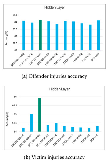 (a) Offender Injuries Accuracy by Hidden Layers; and (b) Victim Injuries Accuracy by Hidden Layers: Different colored bars stand for the highest accuracy is derived from the hidden layers.