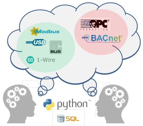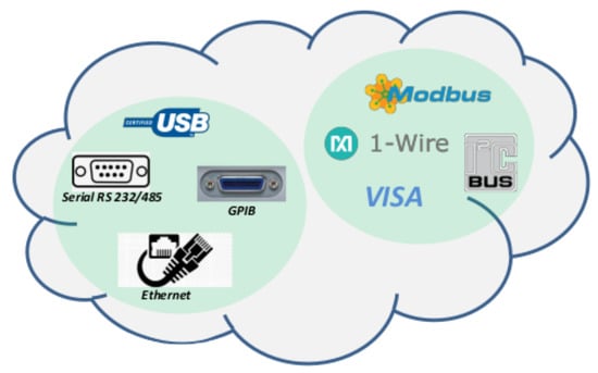 In order to have interoperability with many instruments, the system has to be compatible with several communication protocols (VISA, Modbus, etc.) and several hardware interfaces (USB, Serial, Ethernet, etc.). PyScada offers a wide range of protocols for SCADA systems based on the wide Python open source community and its useful applications such as PyUSB, PySerial, PyVISA, and PyModbus. All the protocols implemented and used are graphically illustrated in Figure 4.