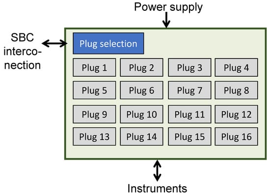 The motherboard interconnects laboratory devices and practical workbench, such as device under test (DUT). It receives and manages all experiment information. Each plug is a DUT and can be easily replaced by the teacher to adapt the scenario to the learner’s profile. The learners will have access to 16 different DUT to achieve their work. For example, DUT in electronics can be a low-pass filter, a high-pass filter, a band-pass filter, an active Sallen–Key filter, a Wien bridge, etc. A multiplexer enables the plug selection according to server request. A specific power card supplies the energy required for the motherboard and the plugs from single phase 230–110 Vac to several Direct Current (DC) power supplies (+15 V, −15 V, 5 V and 3.3 V). The block diagram of the motherboard is described in Figure 6.