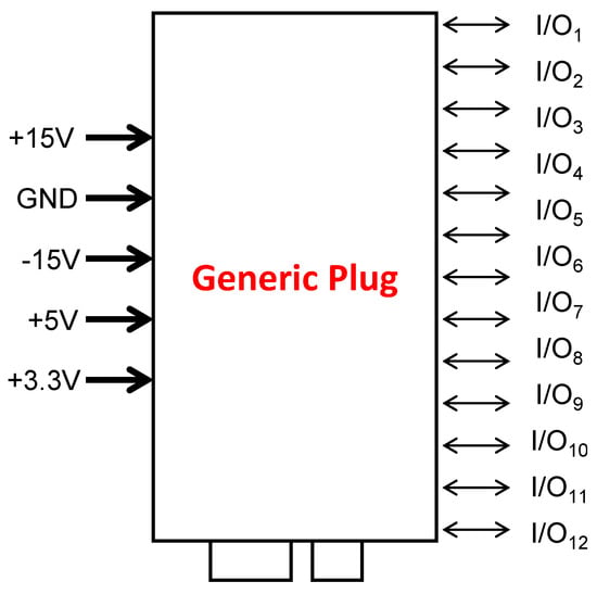 Plugs are designed for all kinds of applications. The DC power supplies from the motherboard are available inside plugs to be fully compatible with TTL or CMOS logics in digital electronics (+5 V and +3.3 V, respectively). The 15 V symmetric supply is used for analog signals that can be positive and negative and typically used with Operational Amplifiers. Moreover, the 15 V can be used for a local power supply if more power is required, for instance to locally heat a temperature sensor. Finally, 12 General Purpose Inputs/Outputs (GPIO), both analog and digital, are available and can be implemented to build experimental workbench or circuit. The plug schematics is described in Figure 7.
