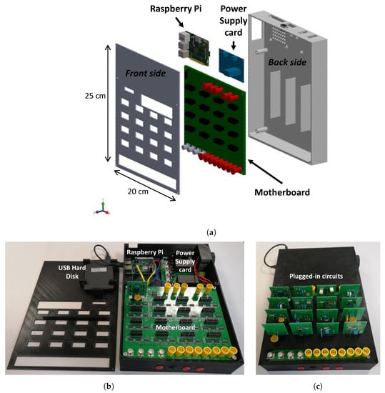 Illustrations of the “Laborem Box”: (a) 3D exploded view; (b) opened box with all elements visible; (c) the box with 16 plugs connected.