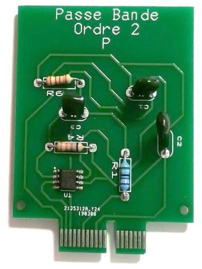 For instance, measurements have been performed on a band-pass active filter among one of the 16 available plugs. The frequency analysis (Bode Diagram) is illustrated in Figure 10, and Figure 11 is the PCB plug picture of the filter.