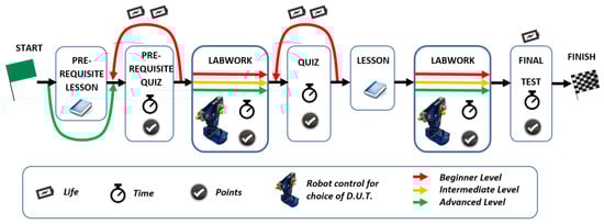 The pedagogical scenario is based on a game-like approach. It includes a treasure hunt and a Top10 of the best measurements. The typical scenario contains introduction lessons (pre-requisite and new theory), quizzes, remote experiments, and a final exam to evaluate knowledge. Like in e-games, the four basic concepts are: level (beginner, medium, advanced), number of lives given (equivalent to number of allowed repetitions), score, or mark obtained for an activity and time spent in the activity. Moreover, an adaptive scenario is implemented to improve learner immersion and motivation in the student learning process as described in Figure 12.