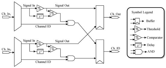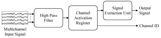 Figure 4 illustrates the proposed channel activation register architecture for a two-channel system. Nonetheless, this design can be replicated for any number of input channels specified by the user. The proposed subsystem takes the filtered signal as its input, and if it has a value higher than the threshold, the subsystem passes the associated channel identification information (Ch_ID) to the buffer register for transmission. Additionally, this unit works as a multiplexer, as it takes multichannel inputs and produces single-channel output (Ch_Out). As previously mentioned, a neural signal is sparse in nature—only one channel is activated during a neural epoch. Here, this single-channel output (Ch_Out) is the activated neural signal which works as the input for the neural activity extraction subsystem of a complete multichannel system.