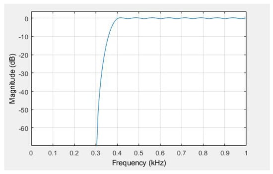 As mentioned in the section methodology, we need to filter out the low-frequency (≤300 Hz) components for extracting single-neuron activity from rat brain signals, as they do not contain any significance. For this purpose, we designed a high-pass equiripple FIR filter. The design parameters were selected as follows: stop-band frequency, = 300 Hz; pass-band frequency, = 400 Hz; stop-band attenuation, = 80 dB; pass-band attenuation, = 1 dB; density factor, . Considering a minimum order design, we get the frequency response of this filter as shown in Figure 2. Here the cutoff frequency is approximately 375 Hz, which is sufficient [] for neural activity extraction.