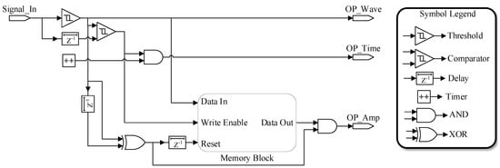 The system architecture of this subsystem is shown in Figure 3. Here, the input signal (Signal_In) of this subsystem is the filtered neural signal. This signal may come directly from an analog filter or from the filter described in the previous subsection. The signal extraction process starts by comparing the input signal with the threshold voltage. When the input signal becomes higher than that voltage, it is allowed to produce the output signal (OP_Wave). At the same time, a count-up timer circuit is used to keep track of time, and the starting time of each neural event is transmitted (OP_Time). Subsequently, a memory block is activated in every epoch to record the peak amplitude (OP_Amp). This value is computed throughout a neural activity, and this block only updates its stored data if the incoming neural signal possesses a greater value than its predecessor. The final value is then transmitted right after each epoch completion.