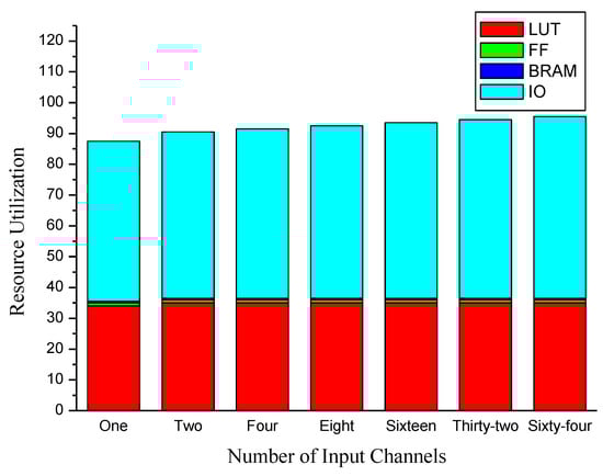 Figure 9 demonstrates this resource evaluation. Here, IO represents the number of input–output blocks in the FPGA. To explain the comparative resource utilization of the systems with a different number of input channels, we need to focus on their design. As discussed in the previous section, the prime difference between a single-channel filtered input system and a two-channel filtered input system is the inclusion of a channel activity register unit. Additionally, the two-channel filtered input system has an additional input and output (channel ID) compared to its single-channel counterpart. Therefore, the two-channel system needs to employ one extra LUT and two IO blocks to facilitate its design. However, when the number of input channels increases from two to sixty-four, no further logic components are needed; only the usage of IO blocks is gradually increased. This analysis indicates that we can effectively increase the number of input channels based on our requirement without overwhelming our system’s resources. This ensures the scalability of the implemented prototype.
