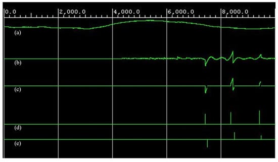 Waveforms from the single-channel unfiltered input system: (a) the input signal (Signal_In), (b) filter output (internal signal), (c) output wave during neural activity (Op_Wave), (d) timestamp (Op_Time) and (e) peak amplitude (Op_Amp).