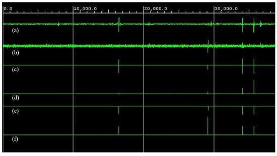 Waveforms from the multichannel (two-channel) filtered input system: (a) input signal from Channel-1 (Ch_In_1), (b) input signal from Channel-2 (Ch_In_2), (c) output wave during neural activity (Op_Wave), (d) timestamp (Op_Time), (e) peak amplitude (Op_Amp) and (f) channel identification (Ch_ID).