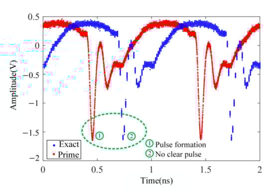 Using the same notation as [18] to select the frequency by prime number rules, P is the number of time samples in a block and R is the cycles of the targeted frequency, which are used to provide statistical information about the waveform. P and R can be decomposed into several prime numbers, respectively, as have been defined in Equations (5)–(7) in [18]. The key point in the selection algorithm is that P or R should avoid large prime number factors, which will rule out lots of choices for the selection. The value for P is arbitrary and can be chosen to give smaller prime factors or a closer frequency to the target. Due to the fact that SRD is not a fully time-invariant system and the waveform will alter as the frequency changes, it is worth picking values of P and R that are both below and above the frequency target so that the magnitude and phase can be interpolated. P and R can be mapped onto a single cycle to provide the statistical information of detailed oversampling. The SRD time-domain output comparison of prime number frequency and exact frequency is depicted in Figure 1, which are represented by the red dot and the blue dot, respectively. The actual frequency SRD output will be overlapped, and the sharp pulse is not precise, while due to the slight deviation in the stimulating frequency, the overall waveform of prime number frequency can be delineated in great detail, and it is obvious to tell the pulse formation of the SRD.