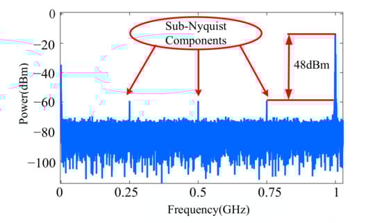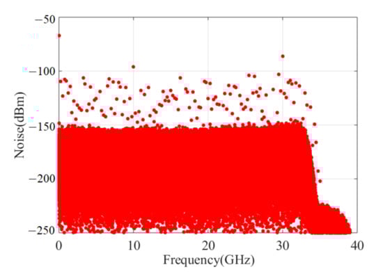 where SDRTO denotes the sampling rate of DRTO, and mADC is the number of ADC in DRTO. The noise response of DRTO is performed to determine the number of ADC. By applying no signal to DRTO, ten groups of raw noise data were acquired. The averaged noise response was depicted in Figure 2, and the parasitic components above the noise floor are the sub-Nyquist spurs. As can be concluded from the results, the minimum sub-Nyquist spur will be 0.25 GHz, and the total number of the ADCs in DRTO is 320, which can be used to select frequencies excluded from the sub-Nyquist spur and the harmonics. What is different from the single-tone algorithm is that the granularity Δf of multi-tone stimulus will be set by the DAC sample rate in the vector signal generator (VSG) rather than the DRTO sample rate. The granularity Δf also corresponds to the modulation period of the multi-tone stimulus, thus providing additional criteria for the frequency selection process to satisfy. If the number of ADC is small, then it is possible that the lowest sub-Nyquist term will correspond to the harmonic value rather than the fundamental. It is notable that re-modulation will occur around the sub-Nyquist tones. Therefore, the harmonic values should also comply with these criteria. The implication is that the overall period may be slightly longer or shorter than the targeted granularity. The “added or reduced samples” is for the selection of nondegenerate combinations of P samples and R cycles in the block. The granularity of the multi-tone stimulus will be set by the DAC sampling space, so the cycle number of DAC should also be taken into consideration. k represents the kth stimulus of the multi-tone signal or the DAC.