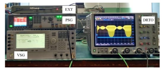 The measurement schematic diagram of the multi-tone stimulus phase reference is shown in Figure 3. The DRTO adopted the phase-locked mode via 10 MHz external clocks, as demonstrated in [20]. The VSG and the pulse signal generator (PSG) Agilent 81160A were connected to the external clock to ensure the synchronization of the three instruments. The PSG provides a trigger signal for the DRTO, and the VSG generates the modulated multi-tone signal to drive the SRD comb generator. During the measurement, the data acquired from the DRTO is imported into MATLAB and transformed into the frequency domain (FFT) for analysis of complex frequency characteristics of multi-tone NVNA phase reference. The objective is to observe the dense spectrum of the intermodulation components around the carrier and harmonics. In the experiment, the SRD pulse generator (Herotek GC1026RC) was driven at an RMS power level of 18 dBm. The measured epoch gives a frequency resolution of 500 kHz, and the nine-tone stimulus has a minimum frequency spacing of 1 MHz, providing additional frequency points to validate time base fidelity.