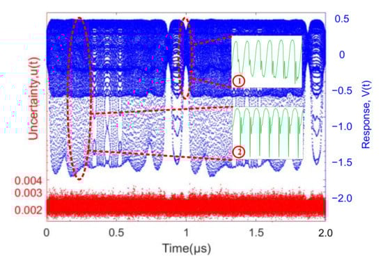 The subscript k denotes kth phase value of stimulus signals. The nine-tone stimulus of Schroeder phases is shown in Table 2. The radians have been transformed into angle values. In the third row, Φk denotes phase-unwrapping results of the Schroeder phase, which are centro-symmetric about the carrier phase. The time-domain response of multi-tone stimulus and the uncertainty is depicted in Figure 5. There does not appear to be any structure to the uncertainty of time-aligned results determined from the standard deviation of time response (100 times). The lack of significant structure suggests that there is little phase error in the corrected result. As the stimulus increased, unlike the first inset of varied amplitude, the second inset with sharp pulse formation provides a better phase standard for NVNA.