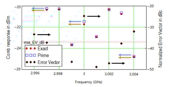 The residual spur level at the fundamental is 48 dBc, corresponding to a phase uncertainty of 0.23°, calculated as the arctan of the residual signals (Figure 10). Also, the results in Figure 8 indicate larger residual components in the results falling between the harmonic components for the exact case. The spurs from the time-interleaved ADCs in the DRTO may introduce systematic errors that will degrade the measurement of the instrument impedance match if this interferes with the CW source within the VNA. The objective is to improve the time and frequency performance of dense comb SRD-based phase-reference use with an NVNA. The multi-tone prime-number frequency-selection algorithm was applied to minimize the effect of sub-Nyquist spurs in the result. Because the RF power is concentrated close to the SRD harmonic frequency, the available power is higher at comb harmonics.