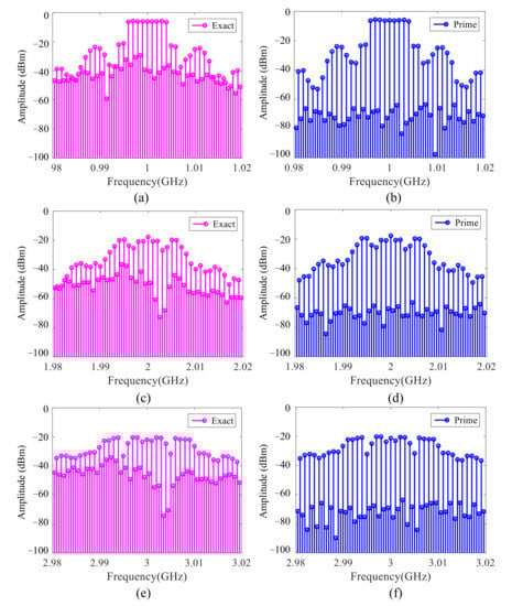 In this part, the frequency domain data processing results will be analyzed, and the two strategies will be compared to verify the validity of prime number algorithms. The amplitude response around fundamental, second, and third harmonics for the nine-tone stimulus waveform is shown in Figure 8. In the exact frequency case, the results show higher values for the inter-comb frequencies because all of the comb/ADC intermodulation products will add coherently. In the prime number case, there is a phase shift, which explains the noise reduction feature of the latter strategy. To compare the two strategies, the components points were shown in Figure 8. The results show good agreement between the two strategies (see Figure 9). It is worth noting that the difference of the two strategies at the sub-Nyquist spurs will be higher than other points, which means the prime number algorithm will offset the influence of the sub-Nyquist spurs on the noise floor and at the same time, the other frequency point responses are almost same as the exact frequency strategy. To sum up, the prime number strategy is equivalent to the exact frequency strategy with improvement of the frequency response at the sub-Nyquist spurs.